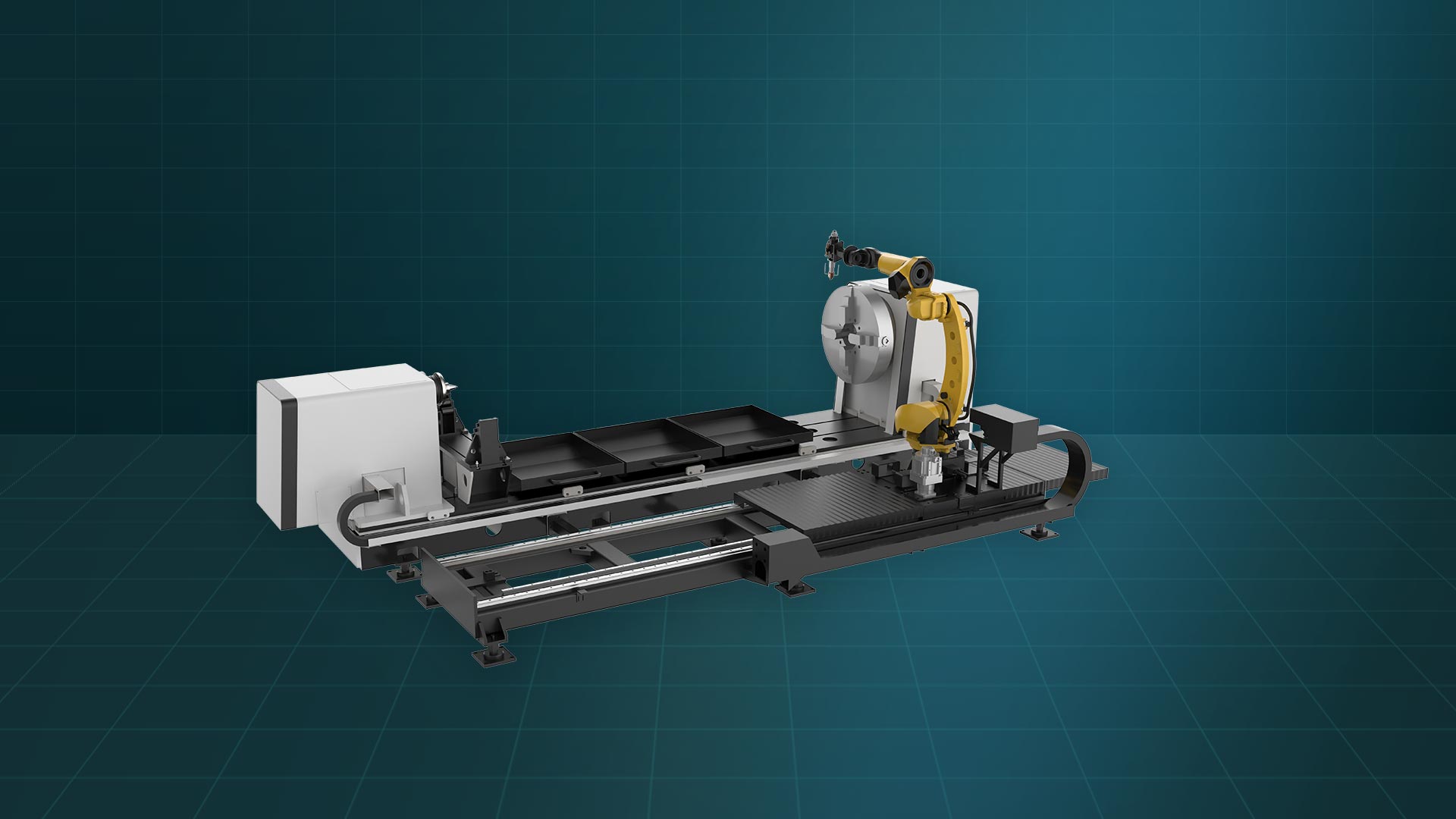 Laser cladding processing is carried out using a robotic arm equipped with optical fibers and cladding heads. The robotic arm is installed on a moving slide and controls the forward and backward movements of the moving slide, driving the robotic arm to move forward and backward, achieving workpiece cladding processing; The workpiece is fixed on the workbench through the front chuck and the rear center tailstock. The rotation of the front chuck drives the workpiece to rotate, and the tailstock moves forward and backward through lifting.