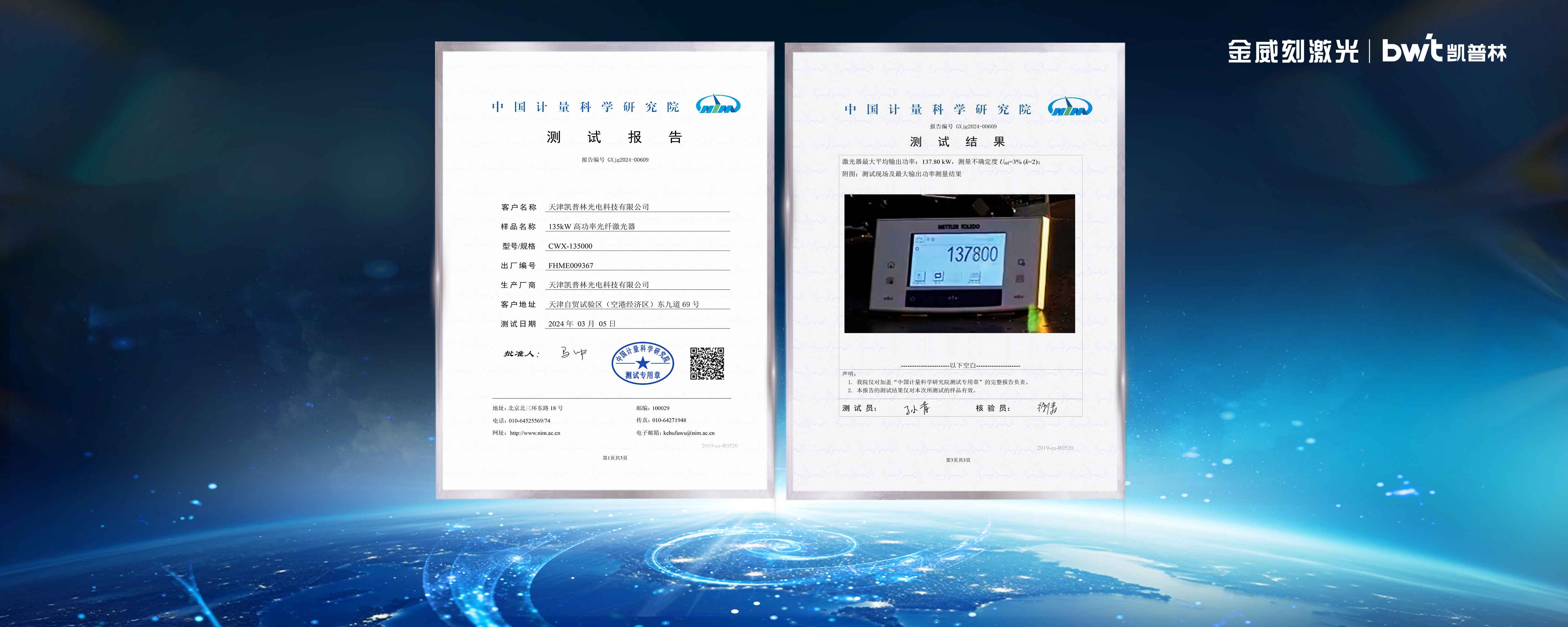 The test report of China National Academy of Metrology Science, was also displayed on the scene. After the detection of the laser, the identification conclusion of the output power of the laser is power ≥135kW, certified as an industrial ultra-thick plate processing laser.