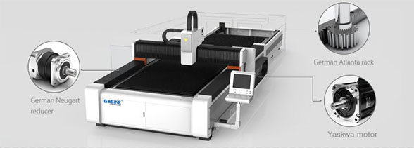 A máquina de corte a laser de fibra G.WEIKE é equipada com parafuso TBI de duplos drivers para o eixo Y importado o parafuso TBI para o eixo X e Hiwin trilho de guia importado e Panasonic servomotor japonês. A precisão de posicionamento da máquina chega ao 0.02mm, a aceleração de corte é de 1.5G, a vida útil é de mais de dez anos.