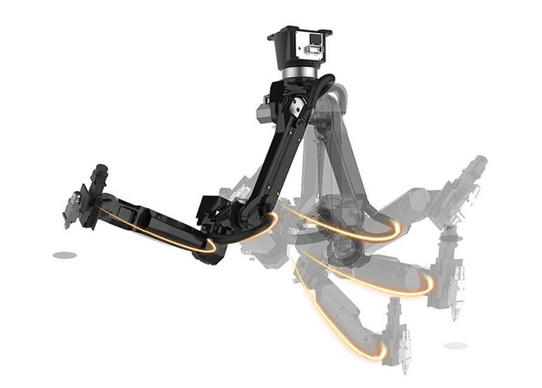 การขยับเชื่อมต่อแบบหกแกนได้รวมเอาอุปกรณ์นำทางลำแสงเลเซอร์เข้ากับแขนหุ่นยนต์ ทำให้มีข้อได้เปรียบในด้านเลเซอร์ของแขนหุ่นยนต์ที่มีการเคลื่อนที่ที่เสถียรและมั่นคง มีการตัดโค้งแบบพลการและเส้นโค้งเฉพาะในสามมิติ